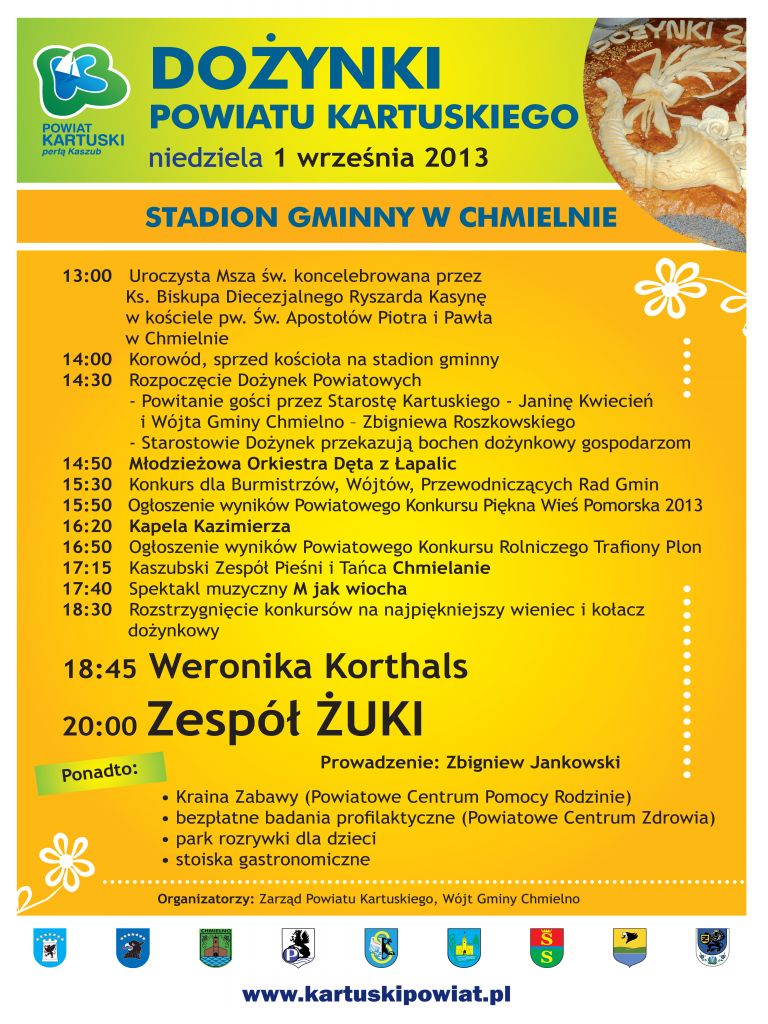 W dniu 1 września 2013 r. w Chmielnie odbędą się Dożynki Powiatu Kartuskiego, podczas których Lokalna Grupa Rybacka Kaszuby zaprezentuje dorobek Kursu Fotograficznego „Kaszuby w obiektywie” jakim są zgromadzone fotografie prezentujące piękno Szwajcarii Kaszubskiej.